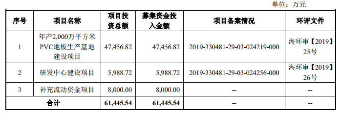 招股說(shuō)明書(shū)顯示,海象新材是目前國(guó)內(nèi)領(lǐng)先的PVC地板生產(chǎn)及出口商之一,主要從事PVC地板的研發(fā)、生產(chǎn)和銷(xiāo)售。此次IPO,海象新材擬將6.14億元募集資金用于年產(chǎn)2000萬(wàn)平方米PVC地板生產(chǎn)基地建設(shè)項(xiàng)目、研發(fā)中心建設(shè)項(xiàng)目、補(bǔ)充流動(dòng)資金項(xiàng)目。