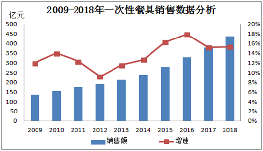 由上圖2009-2018年一次性餐具數(shù)據(jù)分析發(fā)現(xiàn),餐飲數(shù)據(jù)整體增幅可觀,2018年一次性餐具銷售規(guī)模約436億元,同比2010年155億元增幅181.29%,可見(jiàn)一次性餐飲市場(chǎng)規(guī)模發(fā)展速度極快。由于伴隨國(guó)民消費(fèi)水平提高及現(xiàn)在快節(jié)奏社會(huì)生活影響,一次性餐具消費(fèi)規(guī)模呈現(xiàn)令人驚訝速度增長(zhǎng)。